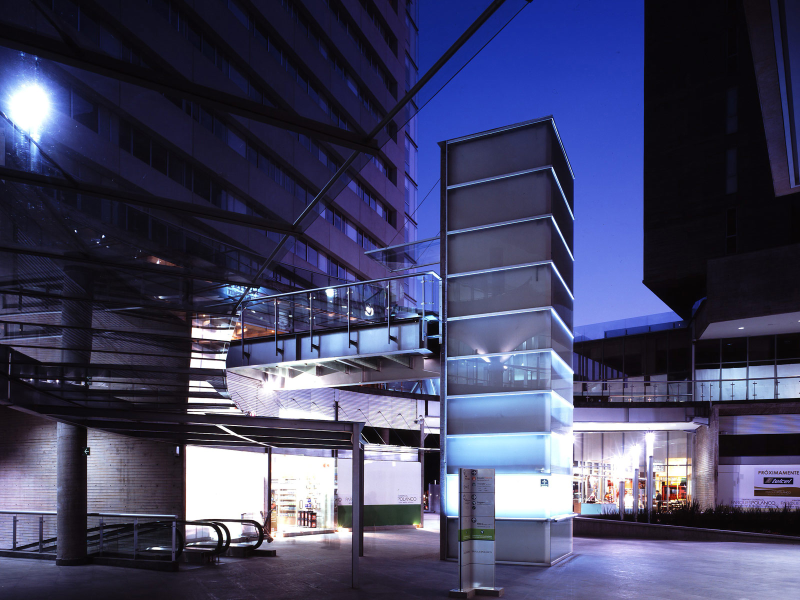Las circulaciones se protegen con elementos ligeros de cristal y los pisos serán de recinto con entrecalles de aluminio natural, de muy buena economía y realizando un diseño dinámico, que hace juego con elementos de jardineras que surgen como prismas encajados. De los bordes metálicos de estos prismas se generan las bancas. Por otro lado, los pies neutros de los locales y el borde de la circulación superior son de concreto aparente enduelado. Todo lo anterior genera una unidad en plazas y circulaciones, mientras que cada edificio de departamentos sobre este basamento tiene su propio lenguaje. En algunos casos los edificios llegan hasta el piso de plazas o circulaciones del área comercial.
