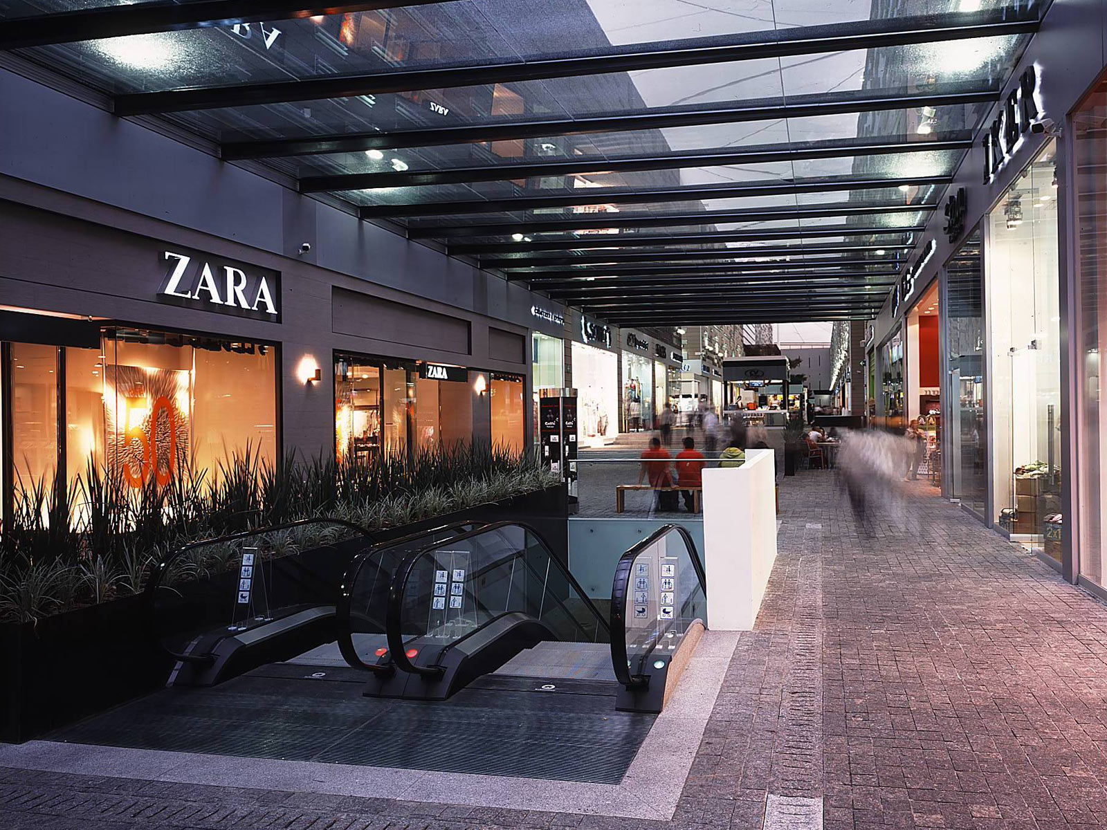 Los materiales utilizados son un adoquín de granito en los pavimentos, cerámica en dos colores y aluminio en los muros, junto con el cristal y la lonaria en los cielos.